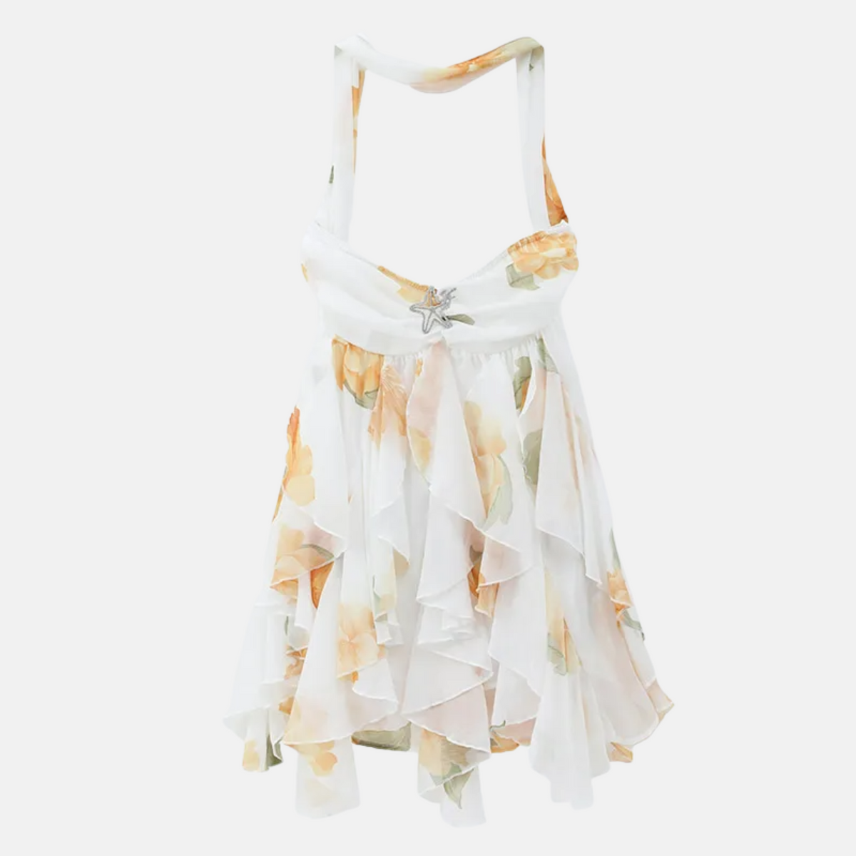Inspired by the effortless romance of the Amalfi Coast. A lightweight chiffon dress with cascading ruffles that move fluidly with the body. Designed for summer evenings, vacations, and refined daytime events.